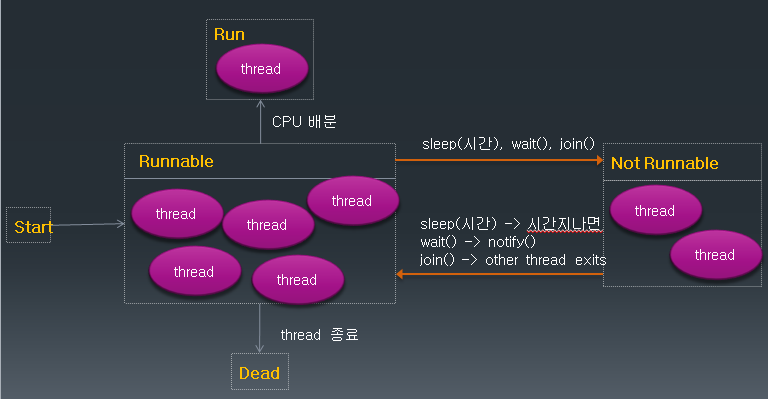 - join() 함수를 호출한 thread는 non-runnable 상태가 되고 다른 thread의 수행이 끝나면 runnable 상태로 돌아온다