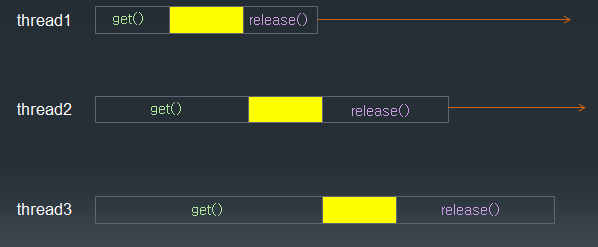 - 한 순간 오직 하나의 thread 만이 semaphore를 얻을 수 있고 나머지 thread들은 대기(blocking) 상태가 된다